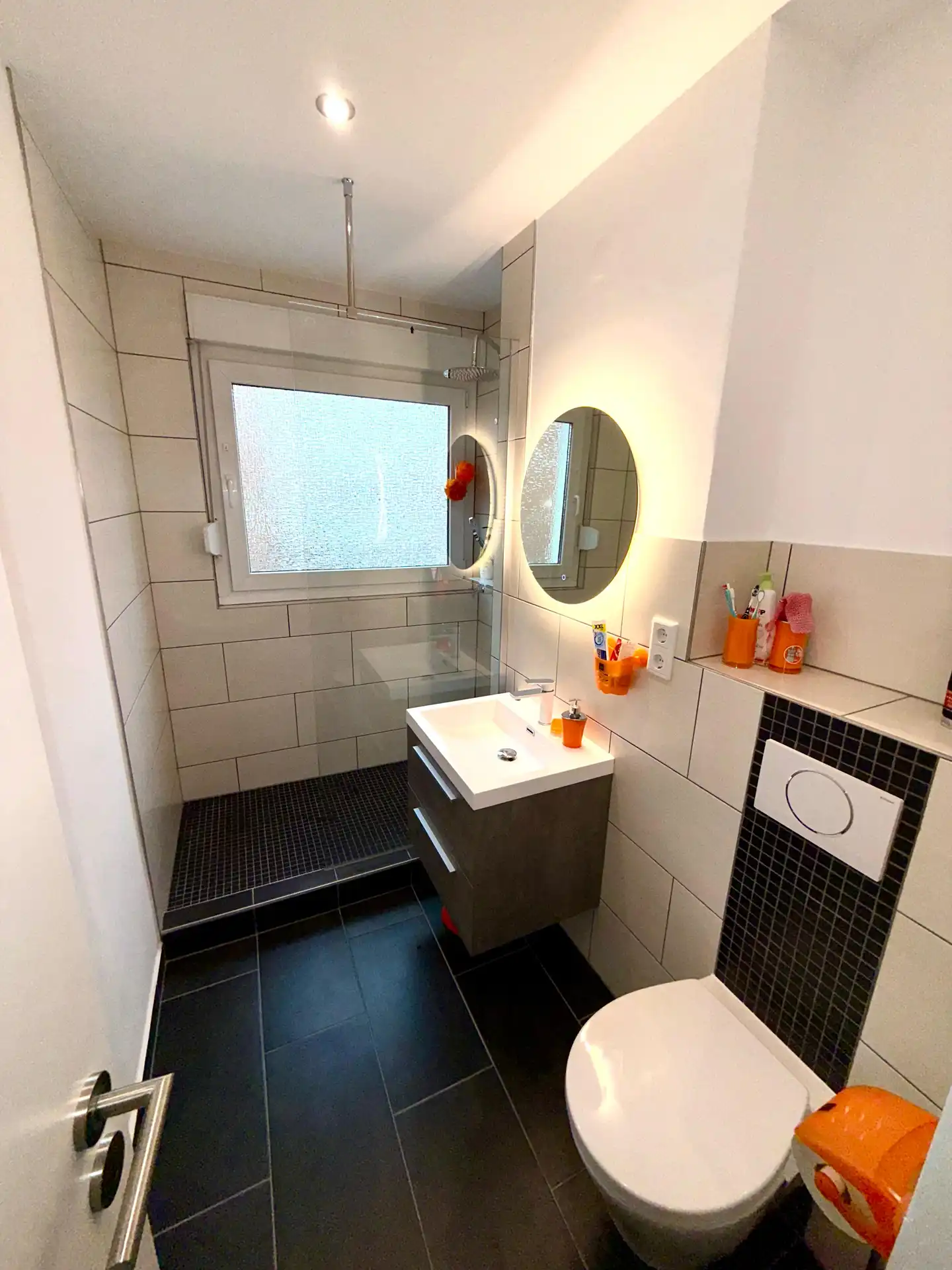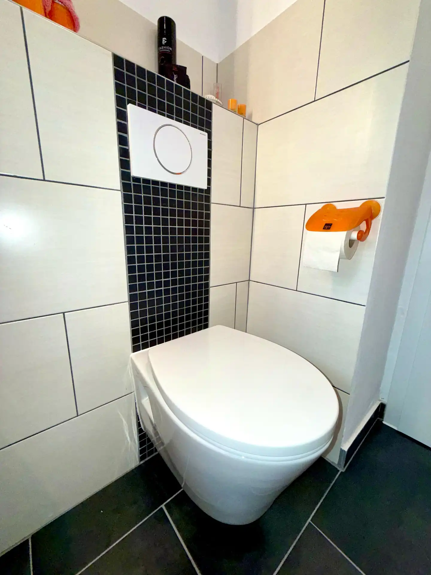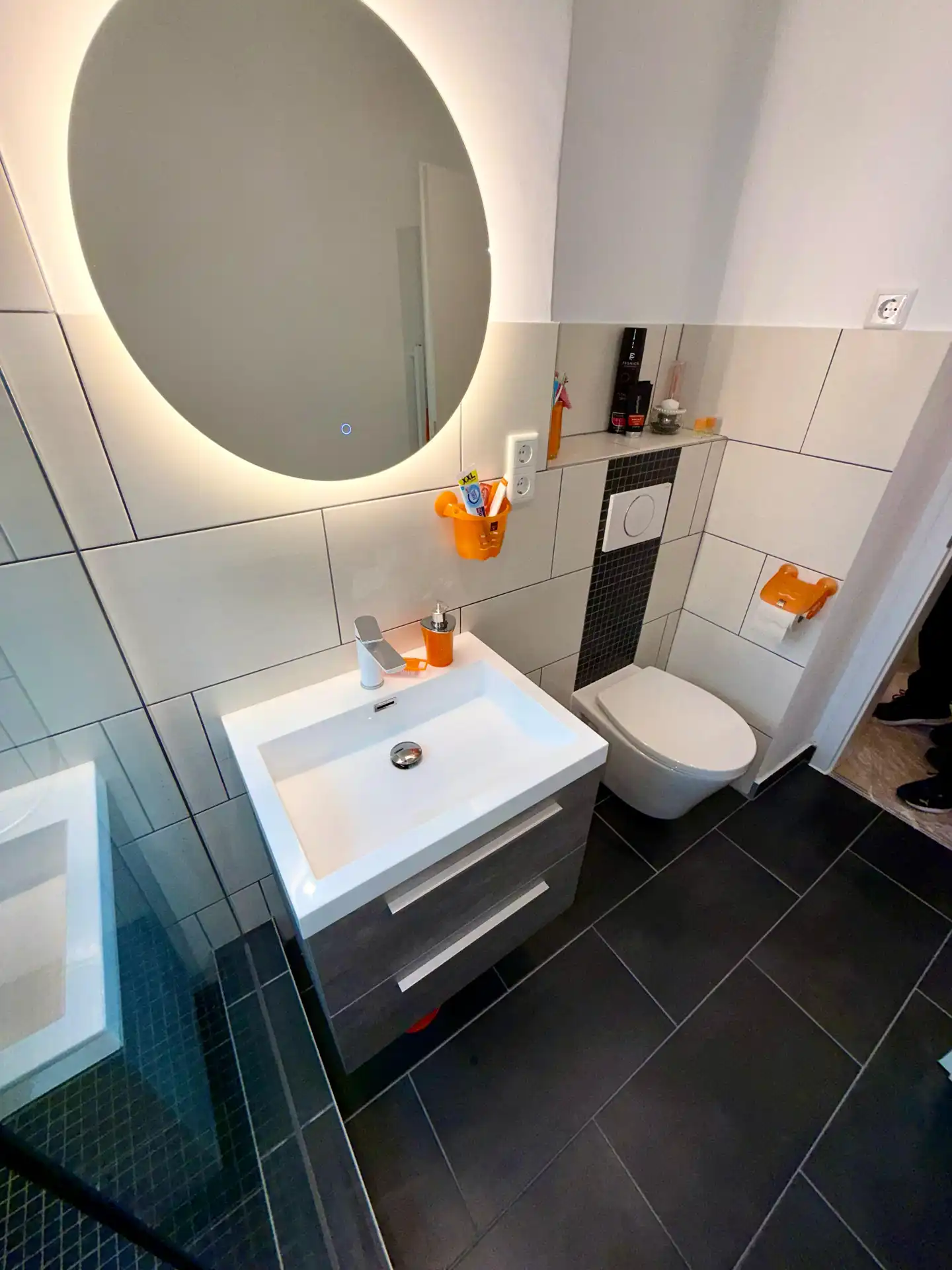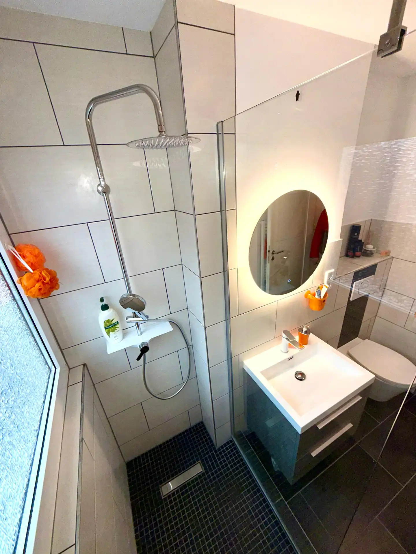 Das Badezimmer wurde vollständig modernisiert und mit hochwertigen Materialien ausgestattet. Der neue Grundriss optimiert die Nutzung der Fläche und steigert den Komfort.