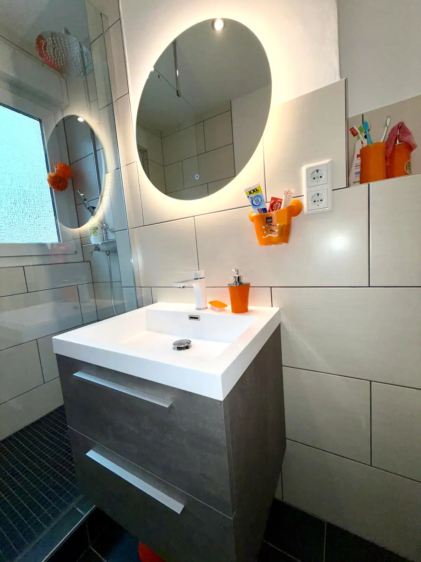 Großformatige Fliesen, moderne Armaturen und eine optimierte Beleuchtung sorgen für ein exklusives Wellness-Erlebnis im eigenen Zuhause. Das Bad vereint Funktionalität und Design auf höchstem Niveau.