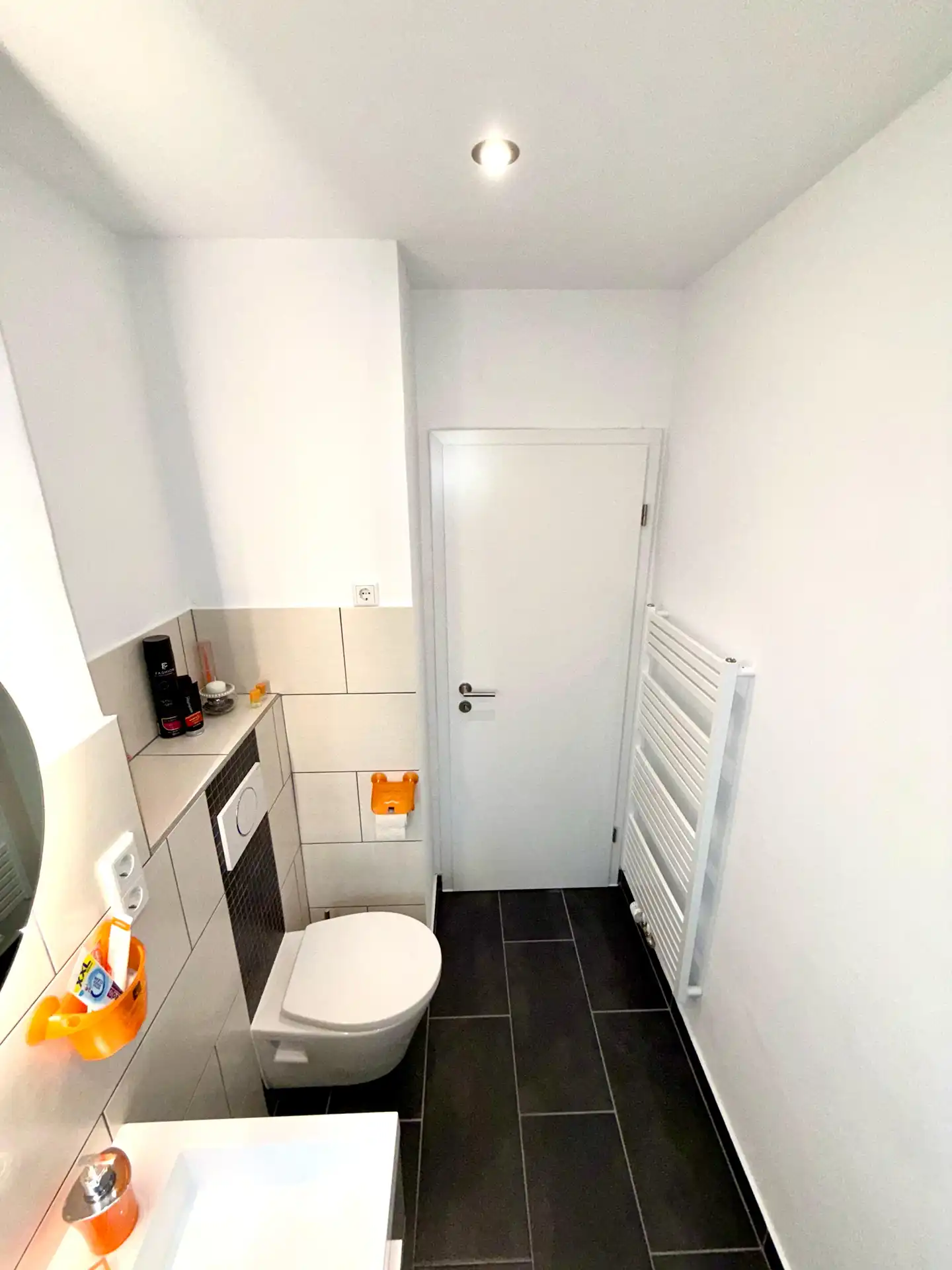 Das Badezimmer wurde vollständig modernisiert und mit hochwertigen Materialien ausgestattet. Der neue Grundriss optimiert die Nutzung der Fläche und steigert den Komfort.