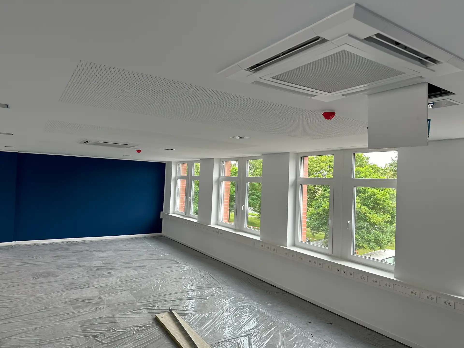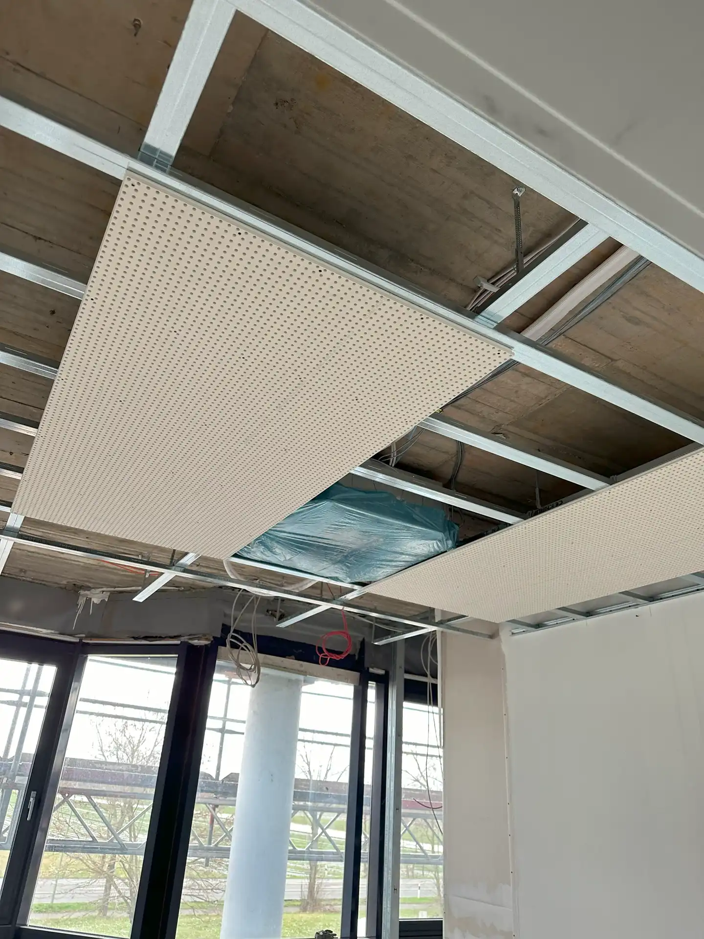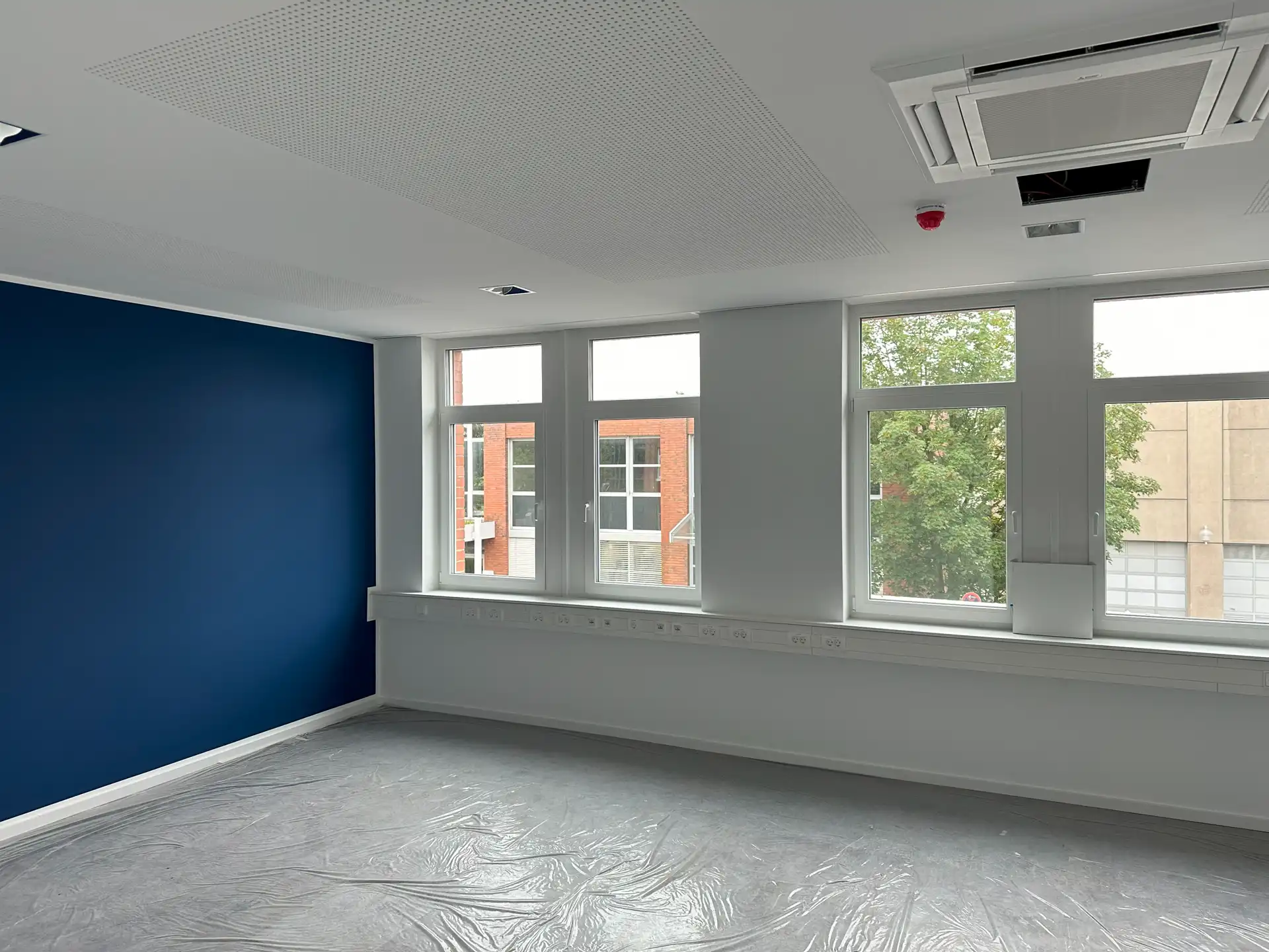 Trockenbau, Akustikdecken und moderne Beleuchtungssysteme wurden eingesetzt, um ideale Arbeitsbedingungen zu schaffen. Die offenen Raumkonzepte fördern die Kommunikation und Kreativität der Mitarbeitenden.
